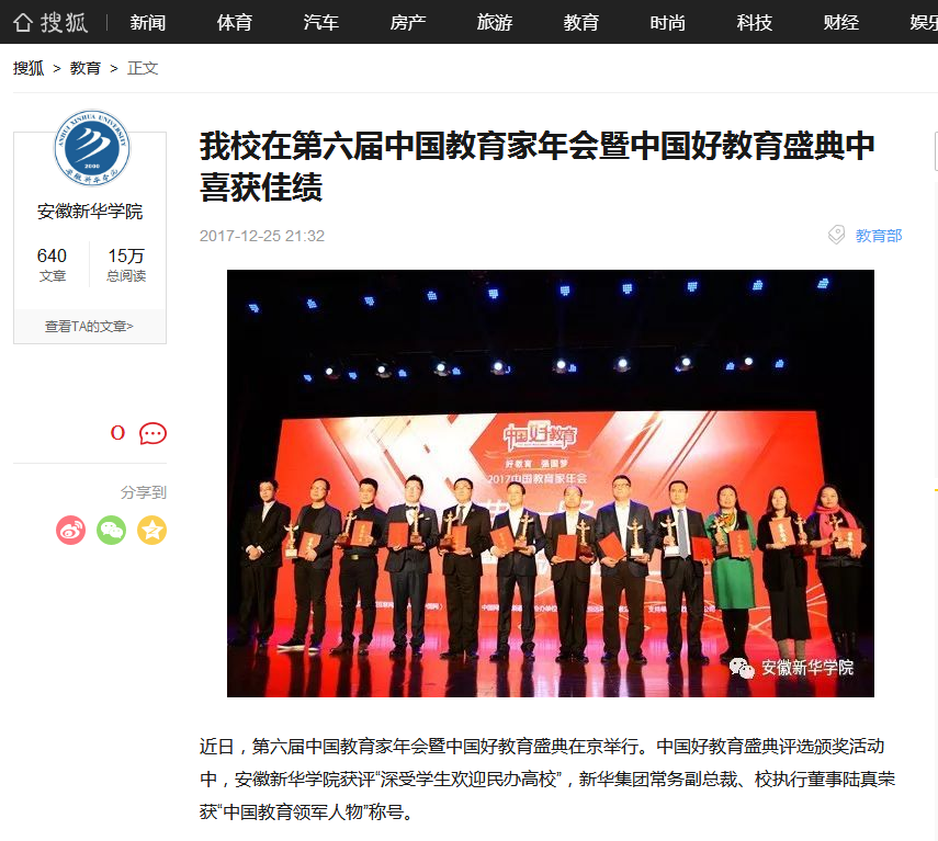 中國(guó)教育在線、鳳凰網(wǎng)安徽、搜狐網(wǎng):安徽新華學(xué)院在第六屆中國(guó)教育家年會(huì)暨中國(guó)好教育盛典中喜獲佳績(jī)