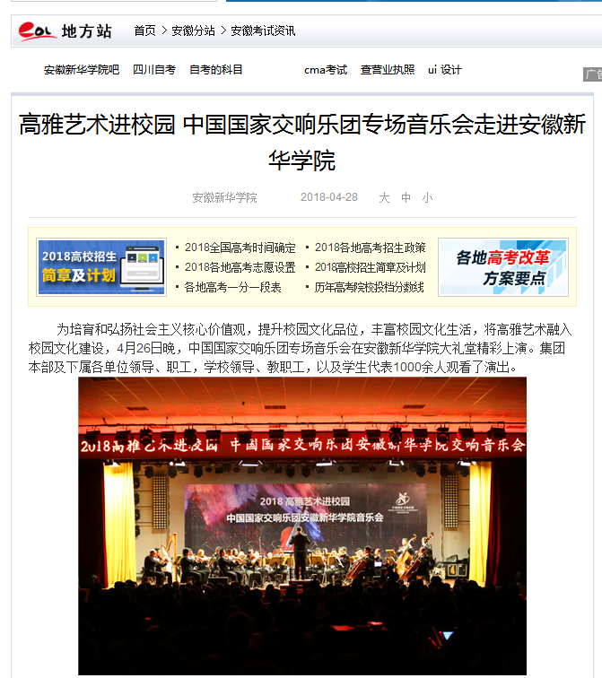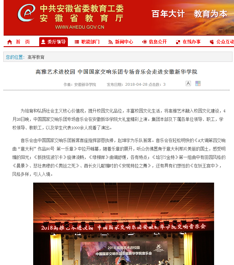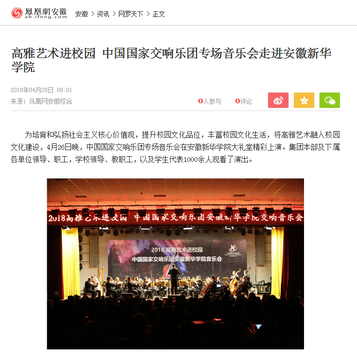 中國(guó)教育在線、安徽教育網(wǎng)、鳳凰網(wǎng)安徽:高雅藝術(shù)進(jìn)校園 中國(guó)國(guó)家交響樂(lè)團(tuán)專場(chǎng)音樂(lè)會(huì)走進(jìn)安徽新華學(xué)院
