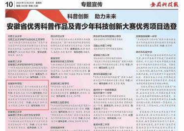 本網(wǎng)訊(通訊員:李苗、李嘉鵬)12月20日,我校第十四屆安徽省百所高校百萬(wàn)大學(xué)生科普創(chuàng)意創(chuàng)新大賽中獲省一等獎(jiǎng)、二等獎(jiǎng)的兩篇優(yōu)秀作品,在《安徽科技報(bào)》專題宣傳版面集中刊發(fā)。