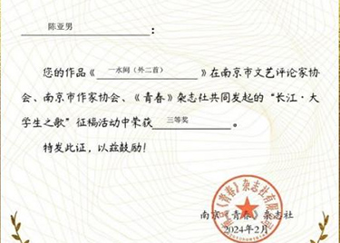 本網(wǎng)訊(通訊員:時綺瀅)近日,由南京市作家協(xié)會、南京市文藝評論家協(xié)會、《青春》雜志社共同發(fā)起并面向全國大學(xué)生的“長江·大學(xué)生之歌”詩集征稿活動發(fā)布獲獎名單,文化與傳媒學(xué)院“華園創(chuàng)意寫作中心”21級漢語言文學(xué)專業(yè)陳亞男同學(xué)的詩歌作品《一水間(外二首)》獲得三等獎。