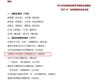 - 2024-03-04喜報!安徽新華學(xué)院青年志愿者聯(lián)合會榮獲“2023年四季度合肥市學(xué)雷鋒志愿服務(wù)最佳志愿服務(wù)組織”