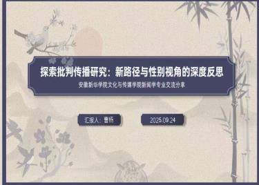 本網(wǎng)訊(通訊員:曹楊)2025年9月24日,安徽新華學(xué)院文化與傳媒學(xué)院新聞學(xué)專業(yè)在教8-103開展了以“探索批判傳播研究:新路徑與性別視角的深度反思”為主題的學(xué)術(shù)研討會,新聞學(xué)專業(yè)教師、圣彼得堡國立大學(xué)媒介傳播與新聞學(xué)博士候選人曹楊,結(jié)合此前參與復(fù)旦大學(xué)第十四屆 “新媒體與全球信息社會的公正傳播” 研究生暑期學(xué)校的學(xué)習(xí)經(jīng)歷作專題匯報。...