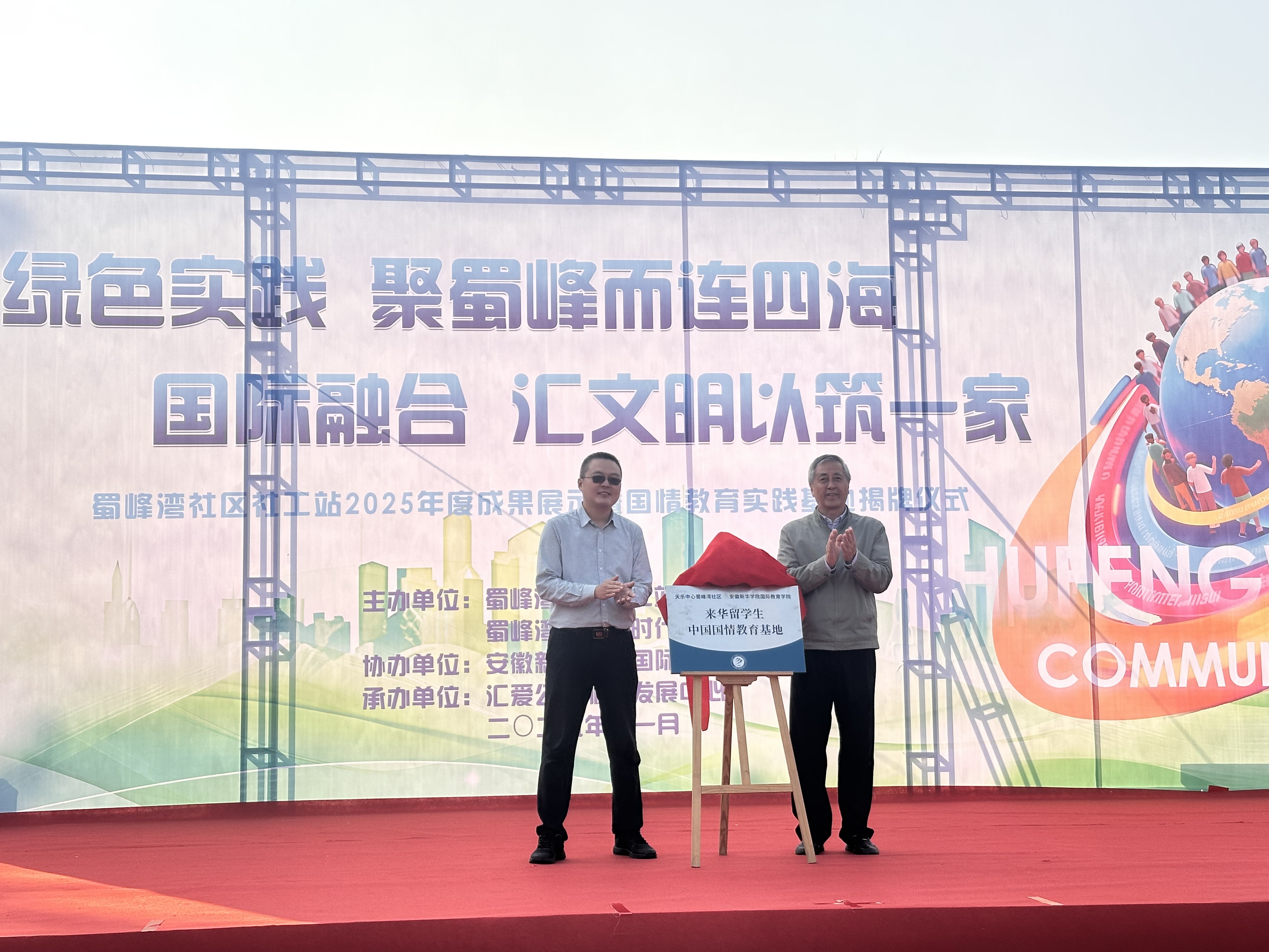 本網(wǎng)訊(通訊員:凌青霞) 為深化校地合作,服務(wù)地方發(fā)展,拓展國際學(xué)生國情教育與實踐平臺,11月14日下午,我校與合肥高新區(qū)天樂中心蜀峰灣國際化社區(qū)隆重舉行“來華留學(xué)中國國情教育實踐基地”揭牌儀式。合肥市社工部基層治理和社會建設(shè)處副處長劉智慧、民政局慈善事業(yè)促進(jìn)處處長完勁松、外事辦公室國際化促進(jìn)處副處長吳凡、高新區(qū)社會發(fā)展局黨...