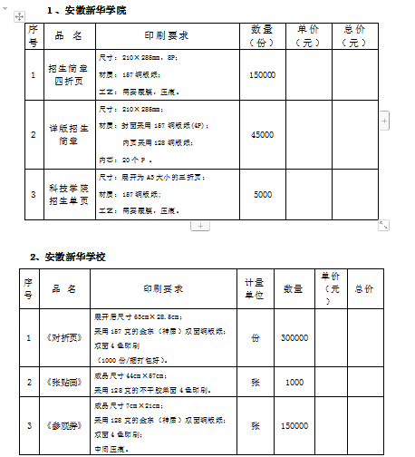 根據(jù)招生工作需要,現(xiàn)對(duì):安徽新華學(xué)院、安徽新華學(xué)校、合肥新華實(shí)驗(yàn)中學(xué)招生簡章項(xiàng)目進(jìn)行公開詢價(jià)采購,歡迎符合資質(zhì)要求并長期從事此類業(yè)務(wù)的廠家前來洽談合作。