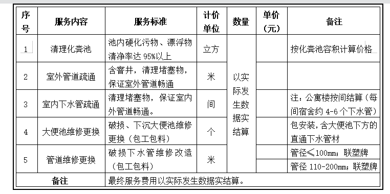 7、對(duì)化糞池、室內(nèi)外管道(含窨井)進(jìn)行清理,及時(shí)將泥沙雜物裝進(jìn)編織袋運(yùn)走,任何垃圾不得堆放現(xiàn)場(chǎng)或甲方校園內(nèi)。施工完成后將池蓋復(fù)原并對(duì)現(xiàn)場(chǎng)進(jìn)行打掃、清洗,確保環(huán)境清潔。