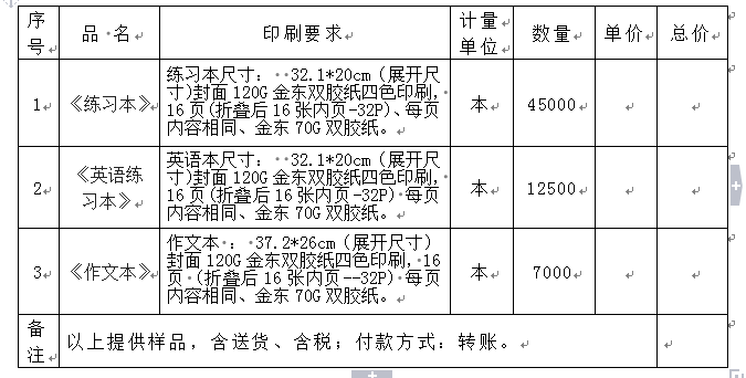 2、詢(xún)價(jià)項(xiàng)目:《練習(xí)本》、《英語(yǔ)練習(xí)本》、《作文本》