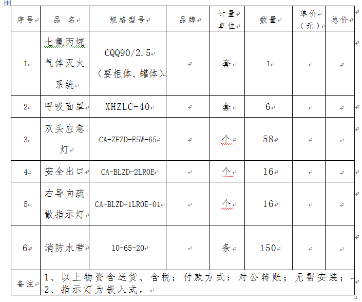 2、詢價項目:七氟丙烷氣體滅火系統(tǒng)、呼吸面罩、雙頭應急燈、安全出口、右導向疏散指示燈、消防水帶。
