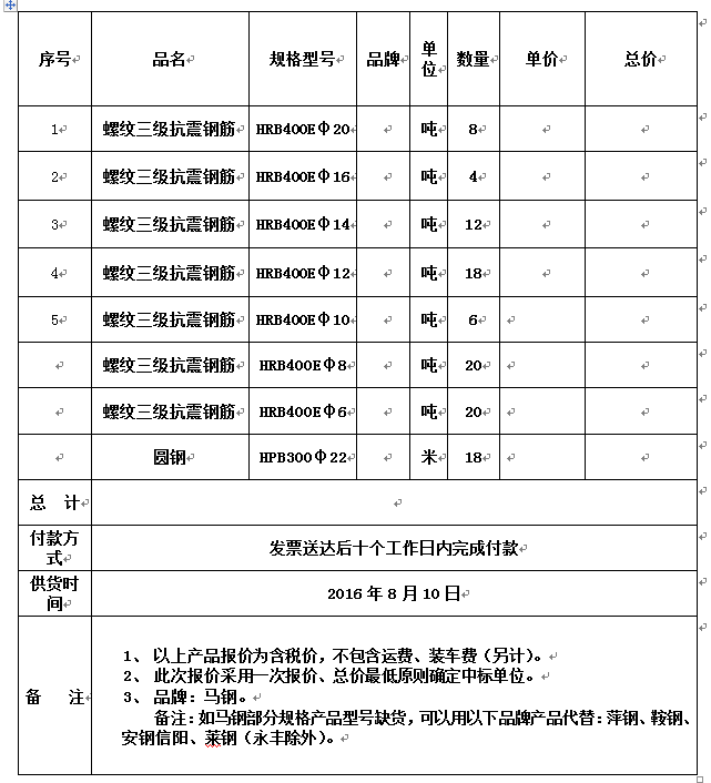 2.須注明各自產(chǎn)品單價(jià)和總價(jià)、付款方式、最快供貨時(shí)間、裝貨費(fèi)用及運(yùn)輸費(fèi)用等。