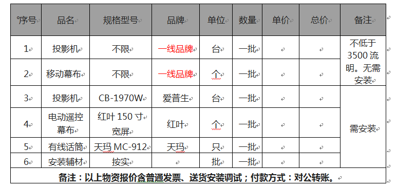 2、履行合同所需的任何項目若未有明確加在所列價款中,該部分有關費用應視作包括在投標報價之內(如運送、設計、調試安裝等);