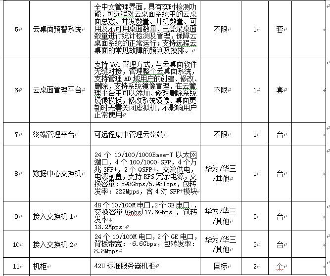 3、招標(biāo)內(nèi)容:三間機(jī)房共計(jì)180個(gè)點(diǎn)的云桌面,考慮到后期擴(kuò)增建設(shè),其中服務(wù)器集群部署到專用弱電間機(jī)房,同時(shí)考慮共享存儲(chǔ)支持及可擴(kuò)展后期GPU虛擬化支持。(具體設(shè)備規(guī)格參考如下但不局限于此:以客戶機(jī)性能體驗(yàn)為主,要求客戶機(jī)最低配置:內(nèi)存≥3G、顯存≥256M)