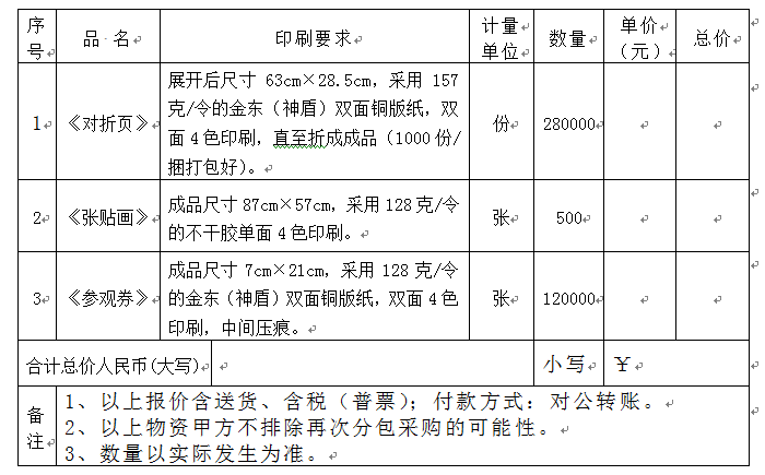 2、詢價(jià)項(xiàng)目:《對折頁》、《張貼畫》、《參觀券》。