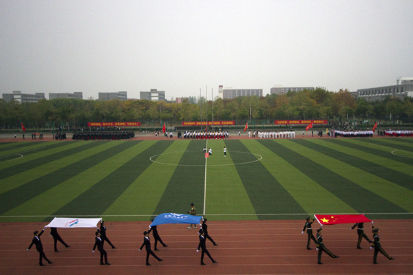 伴隨著激情澎湃的運動員進行曲,氣宇軒昂的護旗隊最先入場,護旗手們高舉國旗、校旗和會旗,踏著整齊劃一、剛勁有力的步伐走過主席臺。由各二級學(xué)院代表組成的方陣依次入場。