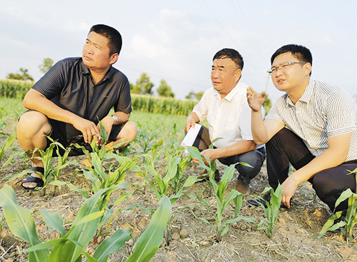 徐旭東(右一)和爺爺徐淙祥、父親徐健(左一)在示范田分析夏玉米生長狀態(tài)