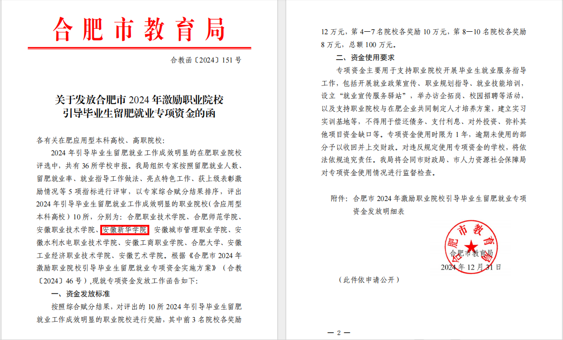 喜報(bào)!我校獲合肥市2024年引導(dǎo)畢業(yè)生留肥就業(yè)專項(xiàng)資金激勵(lì)