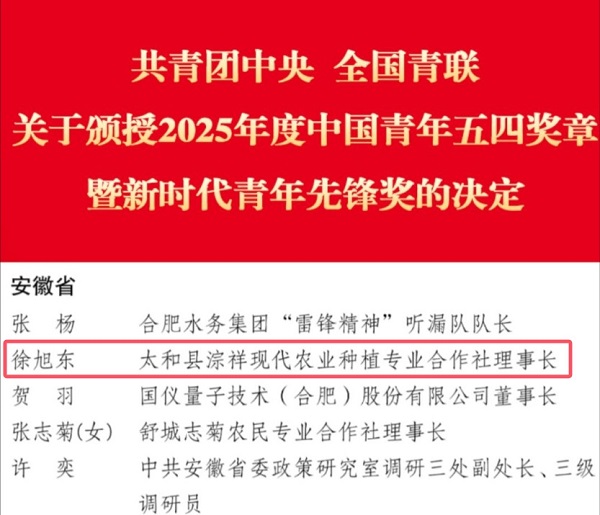 現(xiàn)當選為第十九屆團中央候補委員、第十五屆團安徽省委委員、第十二屆安徽省青聯(lián)常委,曾獲評全國鄉(xiāng)村振興青年先鋒、“皖美新農人”、阜陽青年五四獎章、“阜陽好人”等稱號。同時,徐旭東彰顯青年本色,挺膺青年擔當,積極宣傳黨的路線方針政策,其創(chuàng)作的《牢記總書記囑托,做新時代的種糧人》被評為“全國優(yōu)秀理論宣講微視頻”。