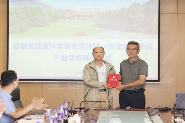 協(xié)議簽署后,安徽新華學(xué)院城市建設(shè)學(xué)院院長沈小璞教授為安徽省建筑科學(xué)研究設(shè)計院等專家頒發(fā)產(chǎn)業(yè)導(dǎo)師聘書。