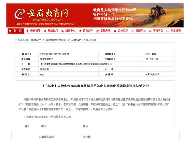 本網(wǎng)訊(通訊員:王強亞) 近日,由中共安徽省委教育工委舉辦的2016年度全省高校輔導員年度人物、優(yōu)秀輔導員評選活動結(jié)果揭曉。經(jīng)各高校推薦,中共安徽省委教育工委組織專家評選,共評選出“2016年度全省高校輔導員年度人物”10名。我校輔導員鄧欣倩憑借優(yōu)秀的學生工作成績,被評為“2016年度全省高校輔導員年度人物”。