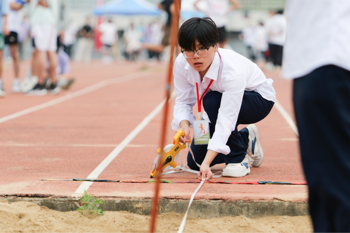 文化與傳媒學院的孫夏天坦言是受到體育老師的吸引,了解到了學生助理裁判這個特別的角色,便毫不猶豫地報名了。作為一名跳遠學生助理裁判,為了勝任這份工作,孫夏天參與了從賽事規(guī)則到跳遠如何測量距離等一系列的系統(tǒng)培訓。“老師手把手教我們?nèi)绾我?guī)范測量跳遠距離,從落地點的確認到精確丈量,每個步驟都容不得半點馬虎。”