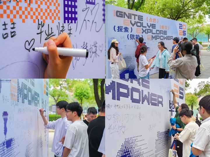 畢業(yè)生們在學(xué)院一樓精心布置的留言墻前久久駐足,用筆墨書寫下自己的名字以及對母校的眷戀與對未來的期許。留言墻前不時(shí)爆發(fā)陣陣笑聲與掌聲,不少低年級學(xué)生專程前來"打卡",有人認(rèn)真抄錄學(xué)長學(xué)姐的寄語作為自己的座右銘。