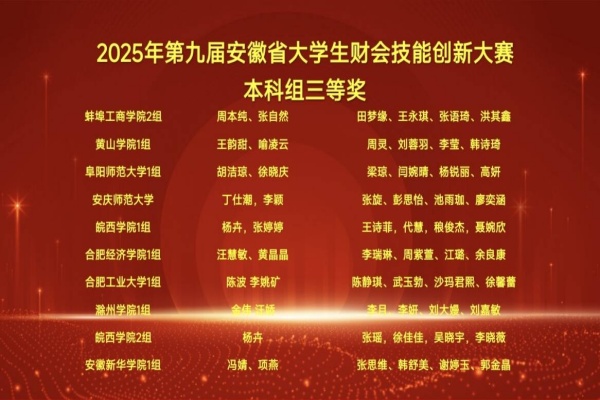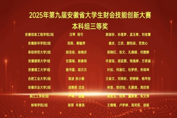 本網(wǎng)訊(通訊員:馮婧)2025年11月15日,第九屆安徽省大學生財會技能創(chuàng)新大賽在銅陵市圓滿落幕。安徽新華學院財會與金融學院選派的兩支學生代表隊,在強手如林的省賽中團結協(xié)作、沉著應戰(zhàn),雙雙榮獲省級三等獎,彰顯了新華學子卓越的專業(yè)技能和扎實的實踐功底。