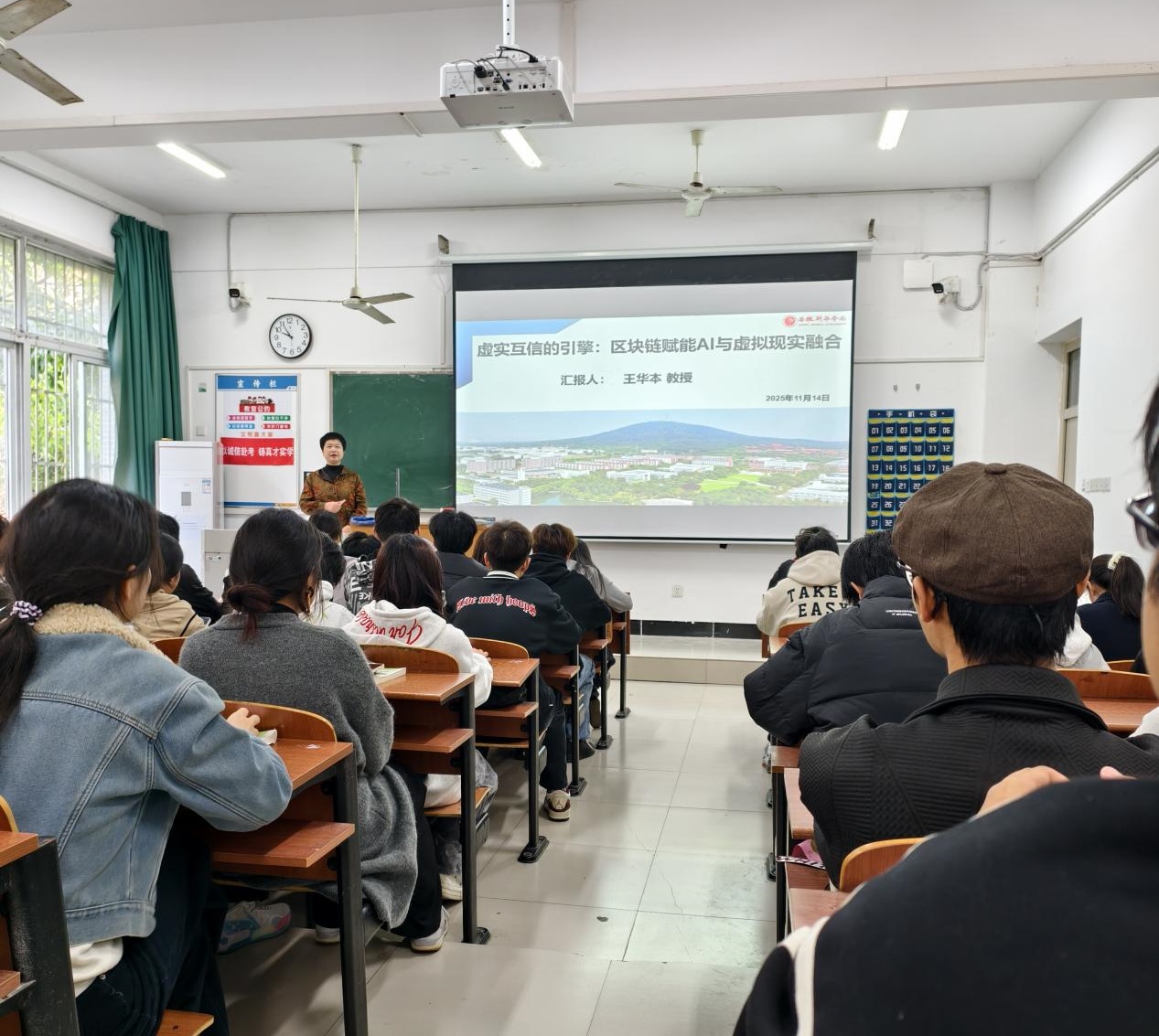 第二場(chǎng)講座《虛實(shí)互信的引擎:區(qū)塊鏈賦能AI與虛擬現(xiàn)實(shí)融合》由王華本教授主講。王教授深入淺出地闡述了區(qū)塊鏈如何作為“信任骨架”,與AI(大腦)、VR(場(chǎng)景)深度融合,解決數(shù)字世界中的身份、資產(chǎn)與行為信任危機(jī),共同構(gòu)建未來可信的“虛實(shí)共生”文明。講座視角新穎,為聽眾勾勒出數(shù)字技術(shù)融合創(chuàng)新的廣闊前景。