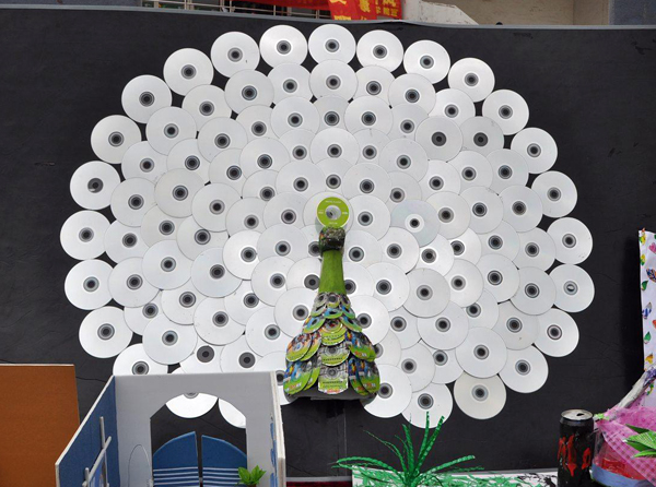 人文藝術(shù)學(xué)院團(tuán)總支學(xué)生會(huì)在此次活動(dòng)中倡導(dǎo):微笑是語(yǔ)言,文明是信念,并以此為口號(hào)來(lái)展現(xiàn)人文學(xué)子文明禮儀的風(fēng)采。在我院所展示的環(huán)保作品中,最吸引眼球的作品莫過(guò)于放置在展示臺(tái)中央的孔雀開(kāi)屏環(huán)保作品,孔雀的全身是有一百多個(gè)光碟構(gòu)成,組成了孔雀開(kāi)屏的美麗瞬間。這個(gè)作品既組成了一幅唯美的而環(huán)保展示圖,也淋漓盡致的展示了我院學(xué)生會(huì)宣傳主題的內(nèi)涵。