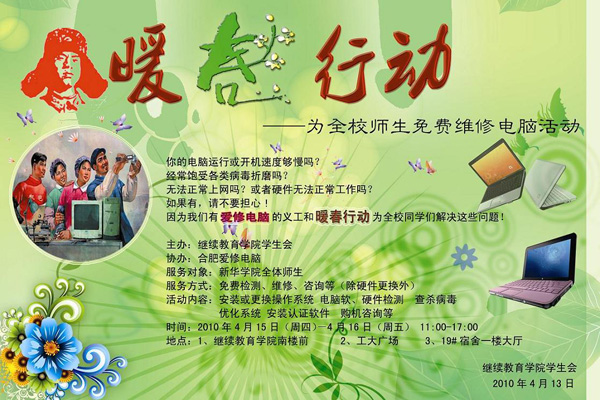 4月15日,繼續(xù)教育學(xué)院學(xué)生會在工大廣場、繼續(xù)教育學(xué)院教學(xué)樓前和19#學(xué)生公寓樓前三個維修點進行全校性電腦免費維修服務(wù)活動。據(jù)了解,活動將會持續(xù)到16日。