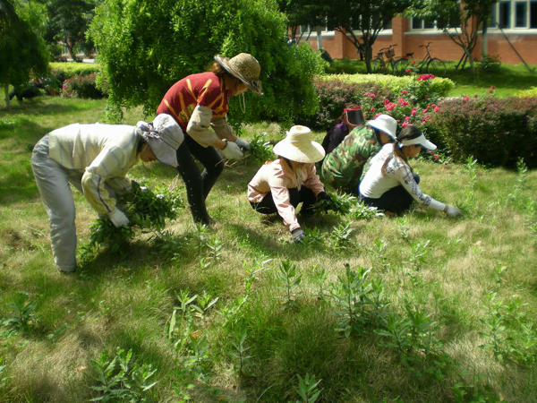 為了美化校園環(huán)境,總務處綠化環(huán)境中心組織130多名保潔人員參加拔除雜草的義務勞動,為十年校慶增彩。
