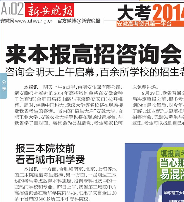 一方面,合肥和南京、北京、上海等地的三本院校遭考生追捧;另一方面,一些剛達三本線的考生考慮放棄本科志愿,投向??婆沃械囊恍衢T學校和專業(yè)。昨日上午,我省第三場皖中片高招咨詢會在新華學院內舉辦,匯集了來自全國20多個省市的300多所三本和專科院校。