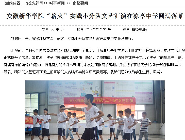 宿松先鋒網(wǎng):安徽新華學(xué)院“薪火”實(shí)踐小分隊(duì)文藝匯演在涼亭中學(xué)圓滿落幕