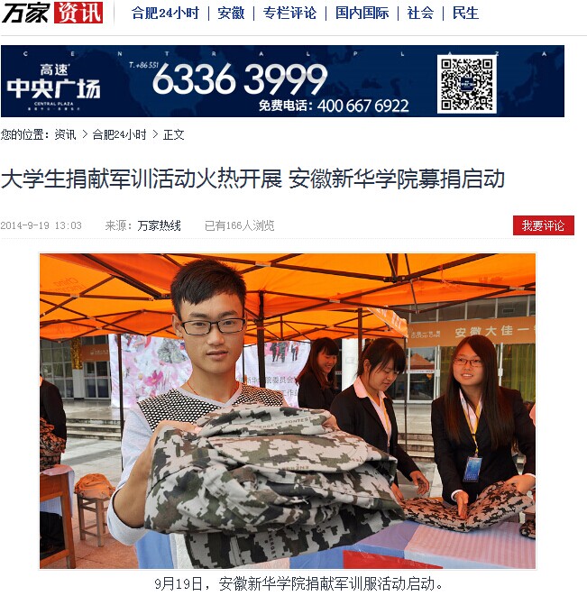 萬家熱線:大學(xué)生捐獻(xiàn)軍訓(xùn)服活動火熱開展 安徽新華學(xué)院募捐啟動