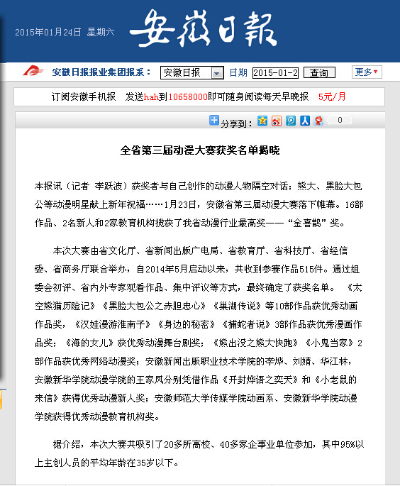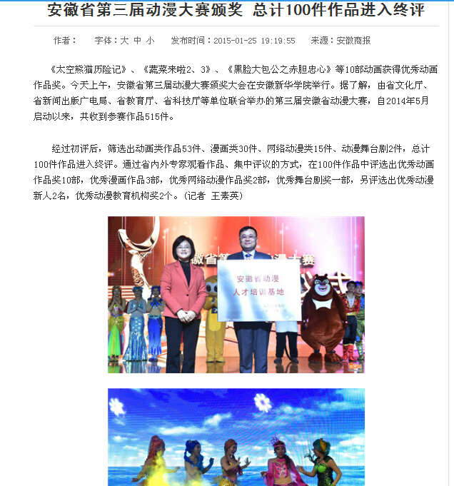 安徽日?qǐng)?bào)、新安晚報(bào)、安徽商報(bào)、中安在線報(bào)道我校承辦安徽省第三屆動(dòng)漫大賽“金喜鵲”頒獎(jiǎng)儀式