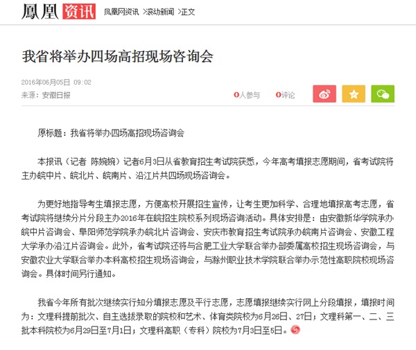 安徽日報、鳳凰資訊、新華網(wǎng)安徽:我省將舉辦四場高招現(xiàn)場咨詢會