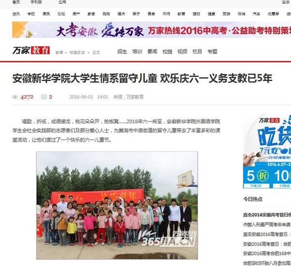 6月1日,《中國教育報》推出題為《安徽新華學(xué)院大學(xué)生情系留守兒童 歡樂慶六一 義務(wù)支教已5年》一文,對我校外國語學(xué)院優(yōu)秀大學(xué)生志愿者定期開展義務(wù)志愿支教的活動進(jìn)行了報道。原文轉(zhuǎn)載如下。