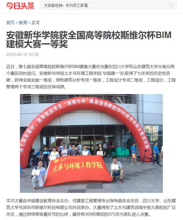 中國教育在線、搜狐網(wǎng)、今日頭條、萬家熱線:安徽新華學(xué)院獲全國高等院校斯維爾杯BIM建模大賽一等獎