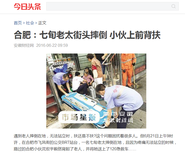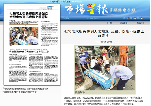 新安晚報(bào)、市場(chǎng)星報(bào)、今日頭條、東方頭條、鳳凰資訊、新浪安徽、萬家熱線等20余家媒體:七旬老太街頭摔倒無法站立 合肥小伙毫不猶豫上前背扶