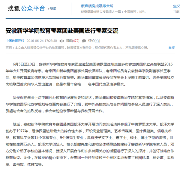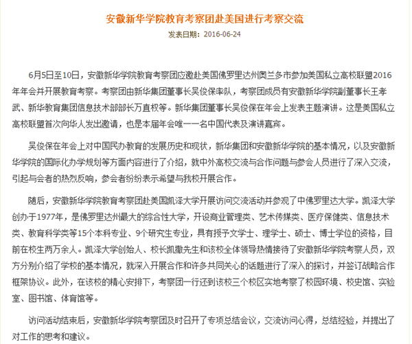 中國教育在線、搜狐網(wǎng)、萬家熱線:安徽新華學(xué)院教育考察團(tuán)赴美國進(jìn)行考察交流