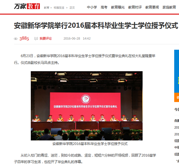 搜狐網、萬家熱線:安徽新華學院舉行2016屆本科畢業(yè)生學士學位授予儀式