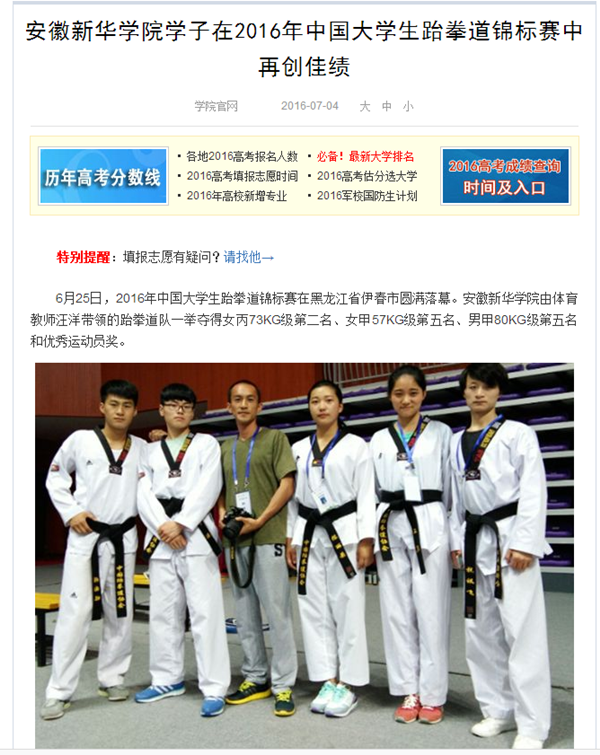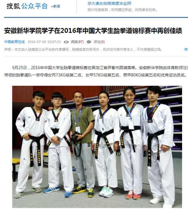 中國教育在線、搜狐網(wǎng):安徽新華學(xué)院學(xué)子在2016年中國大學(xué)生跆拳道錦標(biāo)賽中再創(chuàng)佳績
