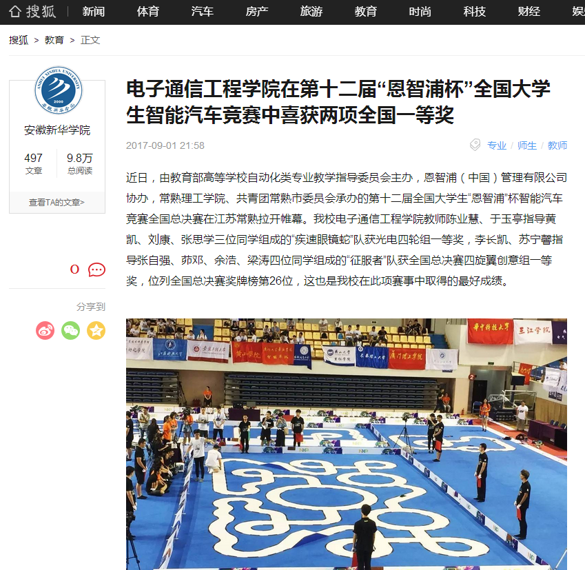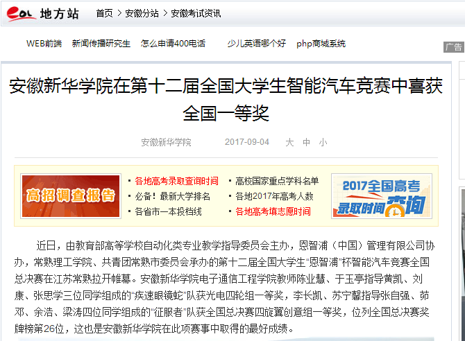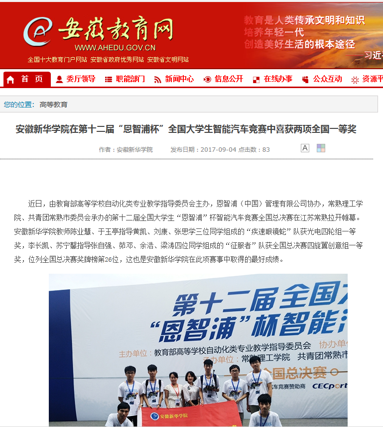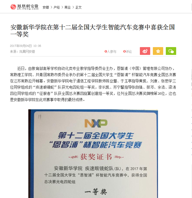 中國(guó)教育在線、安徽教育網(wǎng)、今日頭條、鳳凰網(wǎng)安徽、搜狐網(wǎng)、聚行業(yè): 安徽新華學(xué)院在第十二屆全國(guó)大學(xué)生智能汽車競(jìng)賽中喜獲全國(guó)一等獎(jiǎng)