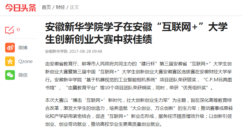 今日頭條:安徽新華學院學子在安徽“互聯網+”大學生創(chuàng)新創(chuàng)業(yè)大賽中獲佳績