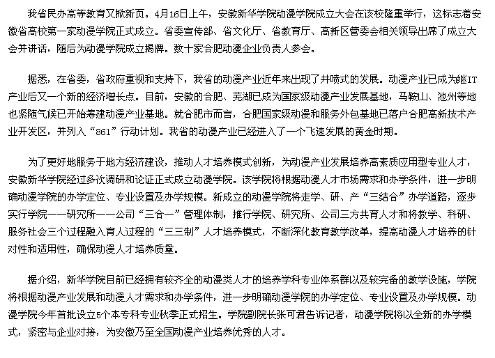 《安徽教育網(wǎng)》:主動服務(wù)新興產(chǎn)業(yè) 我省首家動漫學院成立——安徽新華學院舉辦動漫學院成立大會