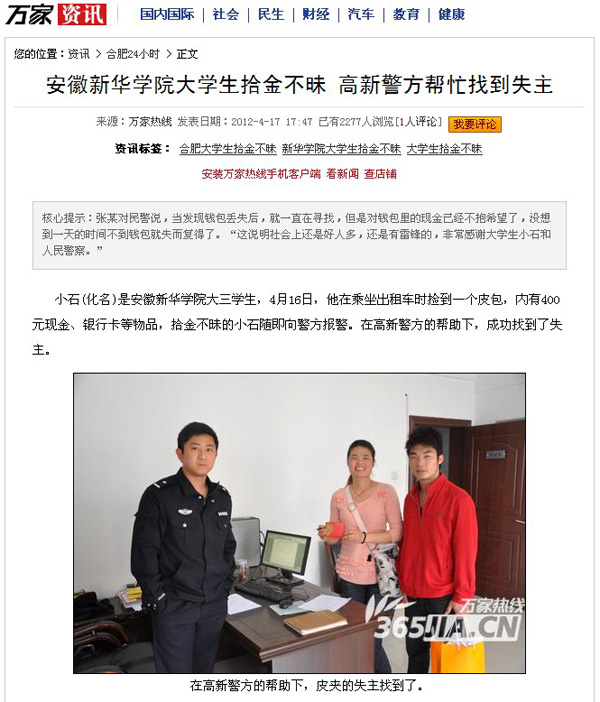 4月17日的萬家咨詢報道了我校大學(xué)生在乘坐出租車時撿到了一個錢包,在高新區(qū)警方的協(xié)助下,成功找到失主。